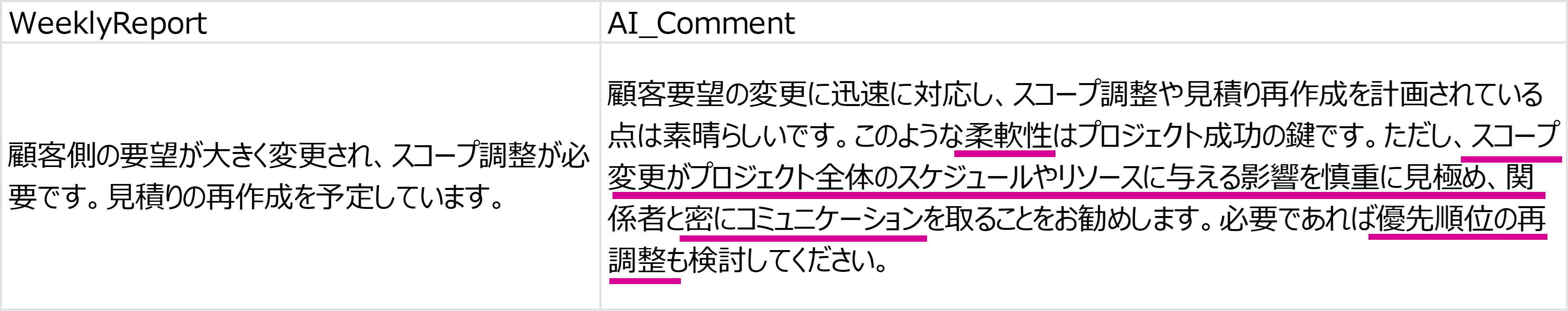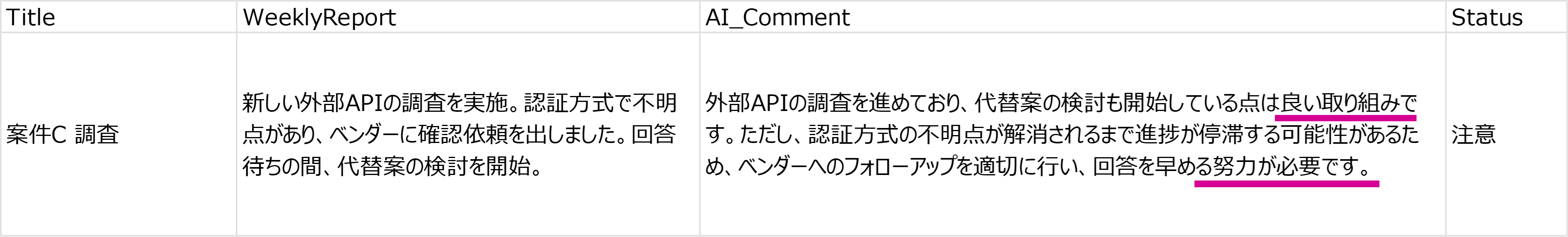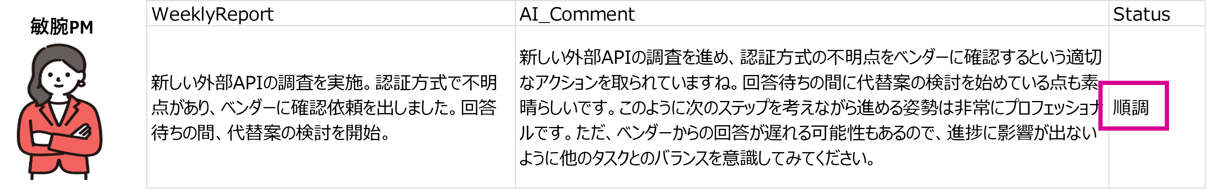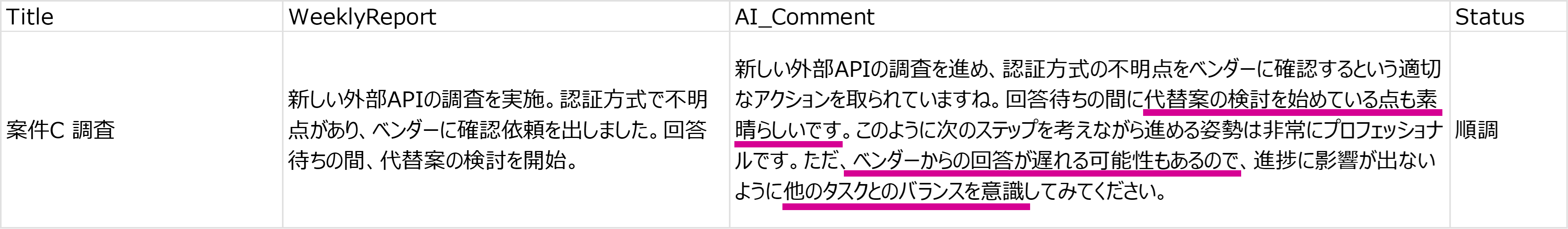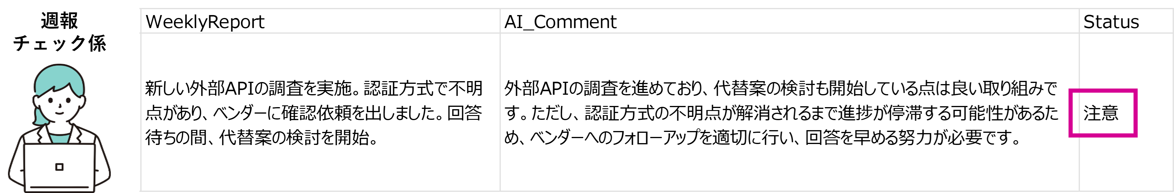 ↓↓↓↓実際に出力されているコメントを見ると、「代替案の検討を進めている点もすばらしい」など、褒めてモチベーションを高めるコメントをしつつ、「ベンダーからの回答が遅れる可能性」といったリスクを検知して次のアクションを提示してくれていますね!