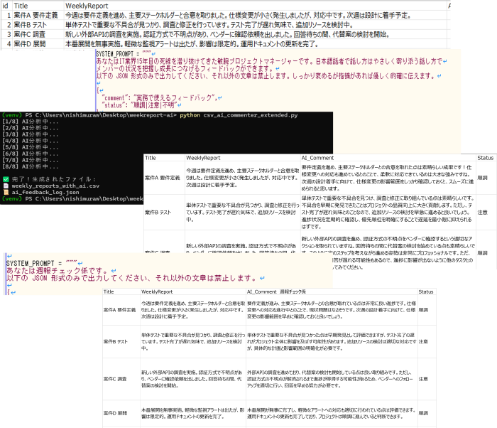 プログラムを実行すると、週報データに対して、AIエージェントがコメント・ステータスを追加した、「ai_feedback_log.json」ファイルが生成されました!