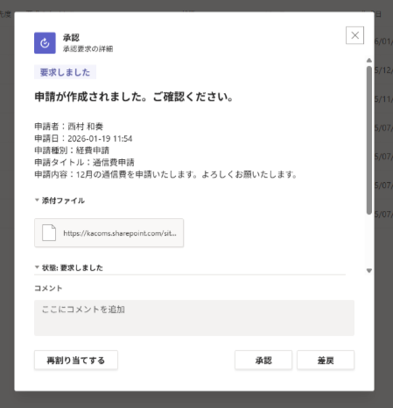 申請を登録すると承認者にTeamsから通知が送信されるようになっています!