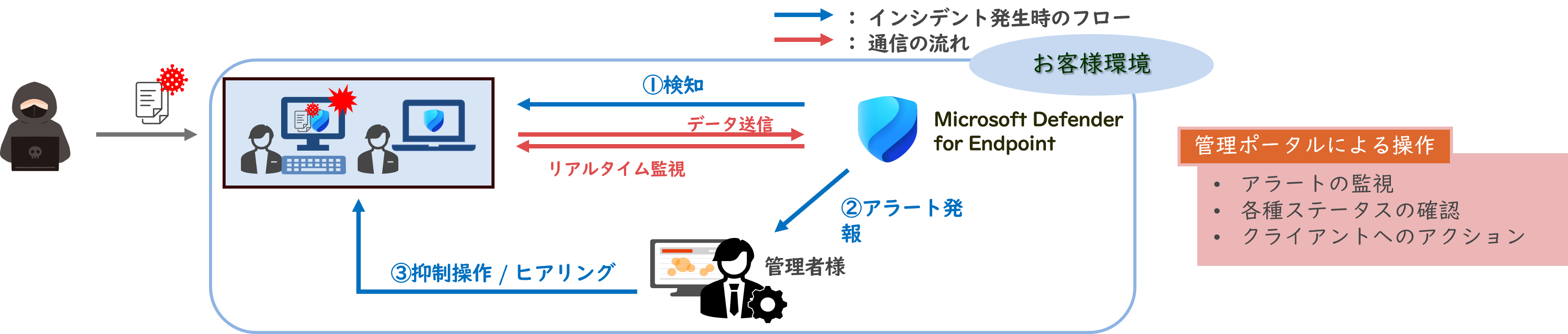 Windows Defenderなどのマルウェア対策機能で防げていた既知の脅威のみならず、昨今、被害が急増している悪意のあるユーザーからのランサムウェア攻撃など未知の脅威に対してもMDEはリアルタイムで監視・対応することが可能です。他にも、攻撃前に発生する不審なプロセスを検知し、未然に攻撃を防ぐクラウド保護機能も搭載されています。機械学習・AIを駆使することで、デバイスの調査や応答など脅威対策を実施します。