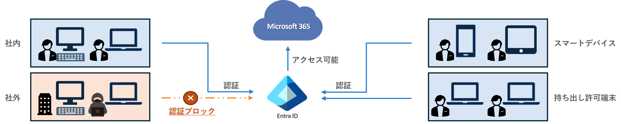 なりすましといった第三者などの悪意のあるユーザーから Microsoft 365 への不正アクセスをブロックし、社内ネットワークなど許可された環境からのみアクセス可能とすることでユーザーIDの保護を実現します。また、認証にはユーザーアカウントのID・パスワードに加え、MFA(Multi-Factor Authentication)認証などの多要素認証を用いた高度な認証を要求することで、よりセキュアな環境を構築することが可能です。