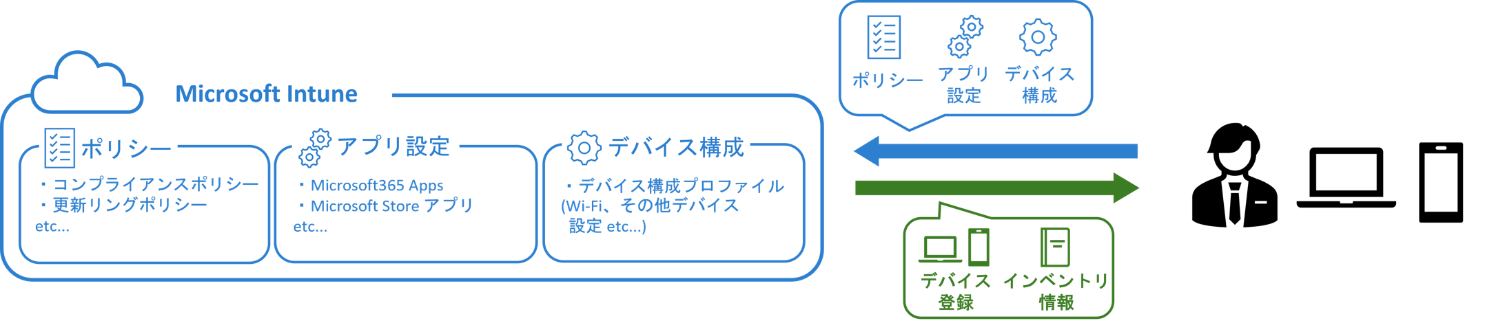 クラウドベースのエンドポイント管理ソリューションであり、MDM(Mobile Device Management:モバイルデバイス管理)とMAM(Mobile Application Management:モバイルアプリケーション管理)の機能を備えております。
