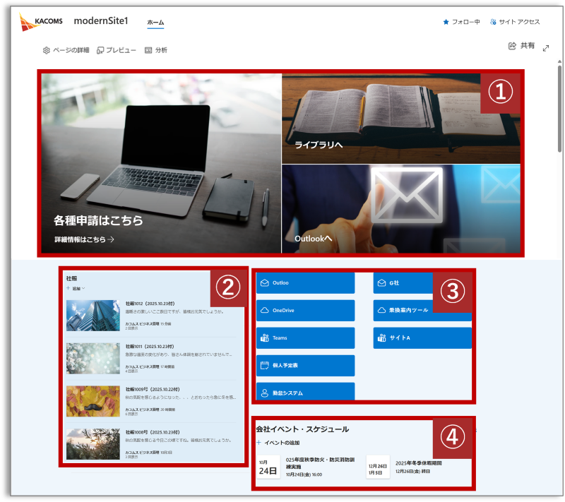 No Webパーツ名 概要 ① 画像表示 サイト上に画像を表示します。 ② 会社内ニュース表示 会社全体で共有したいニュースなどを投稿します。 ③ リンク集 会社全体でよく利用されるリンクを、アイコン形式で表示します。 ④ 全社イベント表示 会社やチームで開催されるイベントを表示します。 - ②柔軟な権限管理が可能!