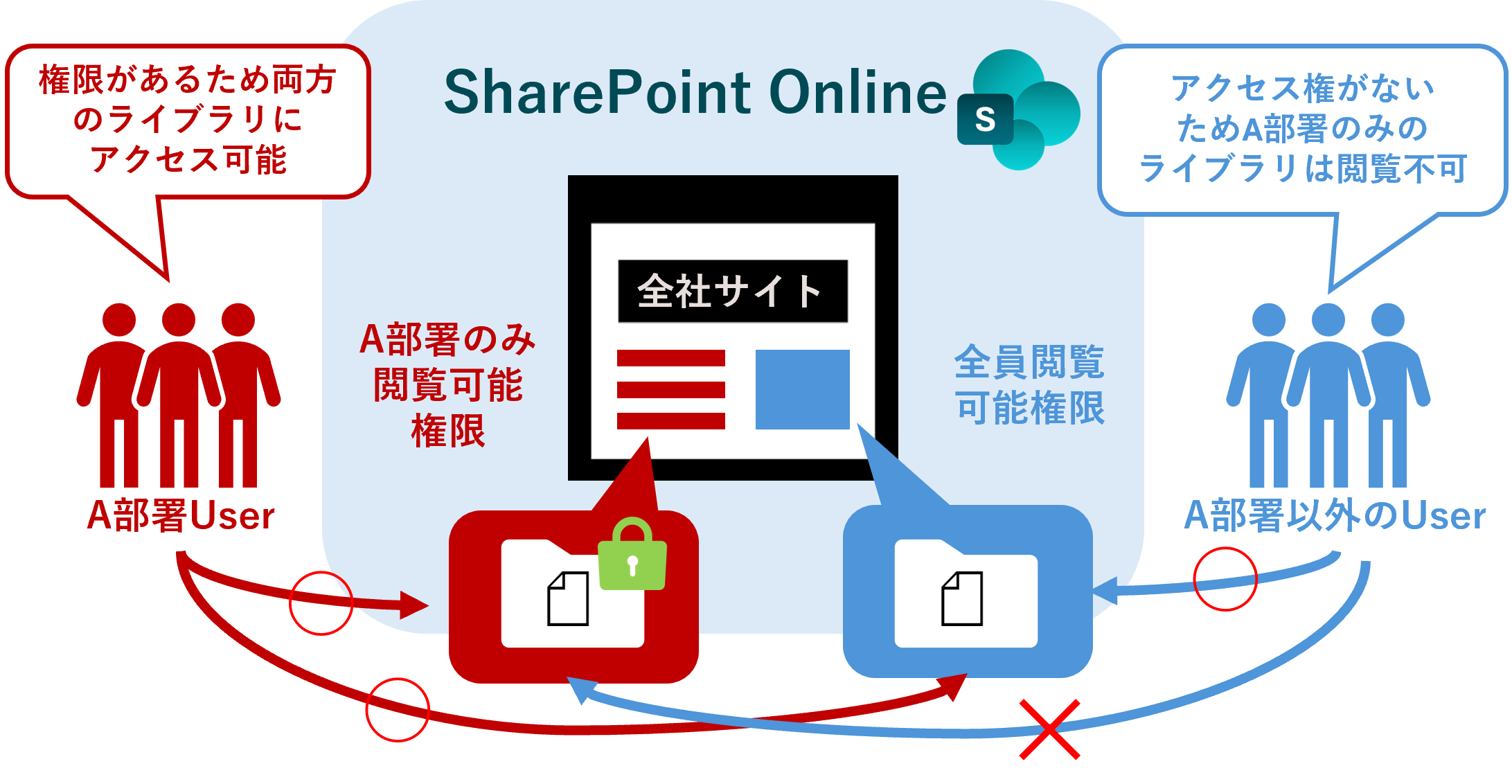 権限を有していないユーザーは、対象の情報やサイトにアクセスすることはできない動作ですので、情報漏洩などのセキュリティリスクを低減することが可能です。そのため、機密情報などセキュリティ性を求められるドキュメントの保管場所としても最適です。