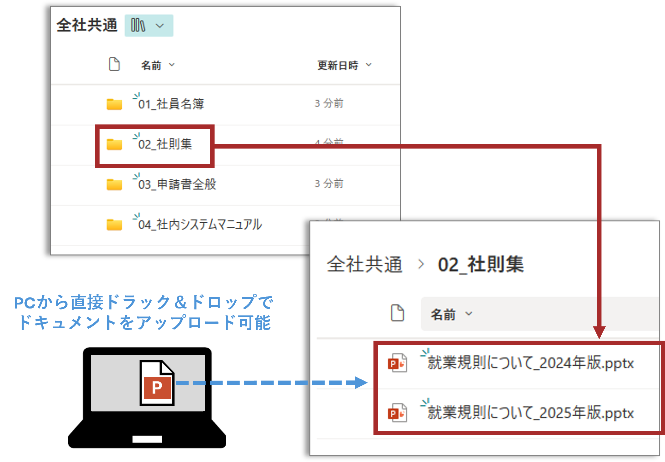 ドキュメントライブラリを作成し、情報を集約することで管理者はドキュメントの管理が容易となります。