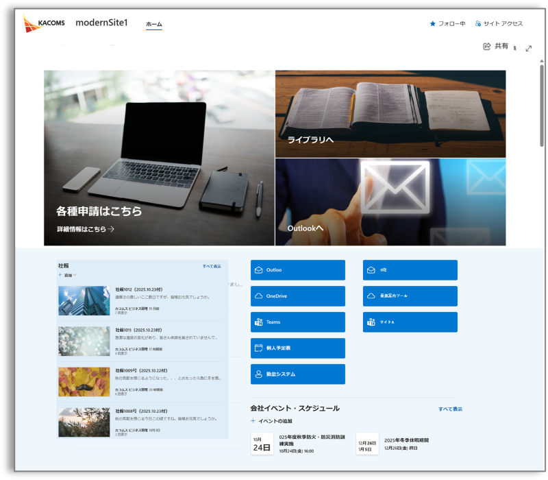SharePoint Online上で、社内ポータルサイトの構築を行います。