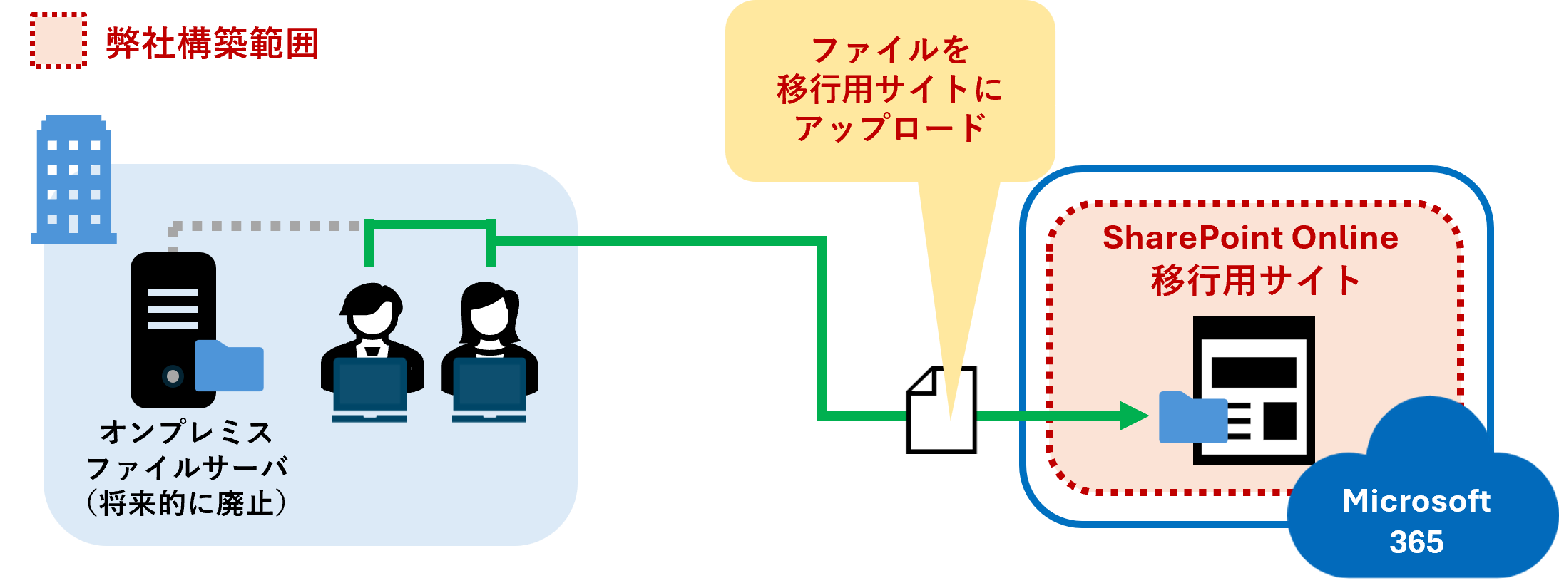 既存のオンプレミスファイルサーバから、SharePoint Online上のポータルサイトへ保存領域を変更することにより、お客様のインフラ環境の更なるクラウド化を促進します。