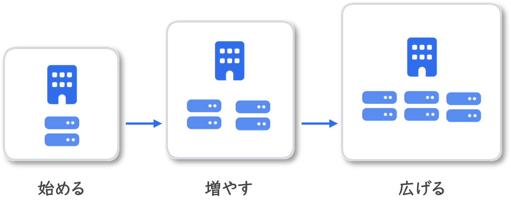 • 初期導入は小規模な構成から開始し、ビジネスの成長や新たな要件に合わせて、運用状況や業務変化に応じた段階的な拡張が可能です。