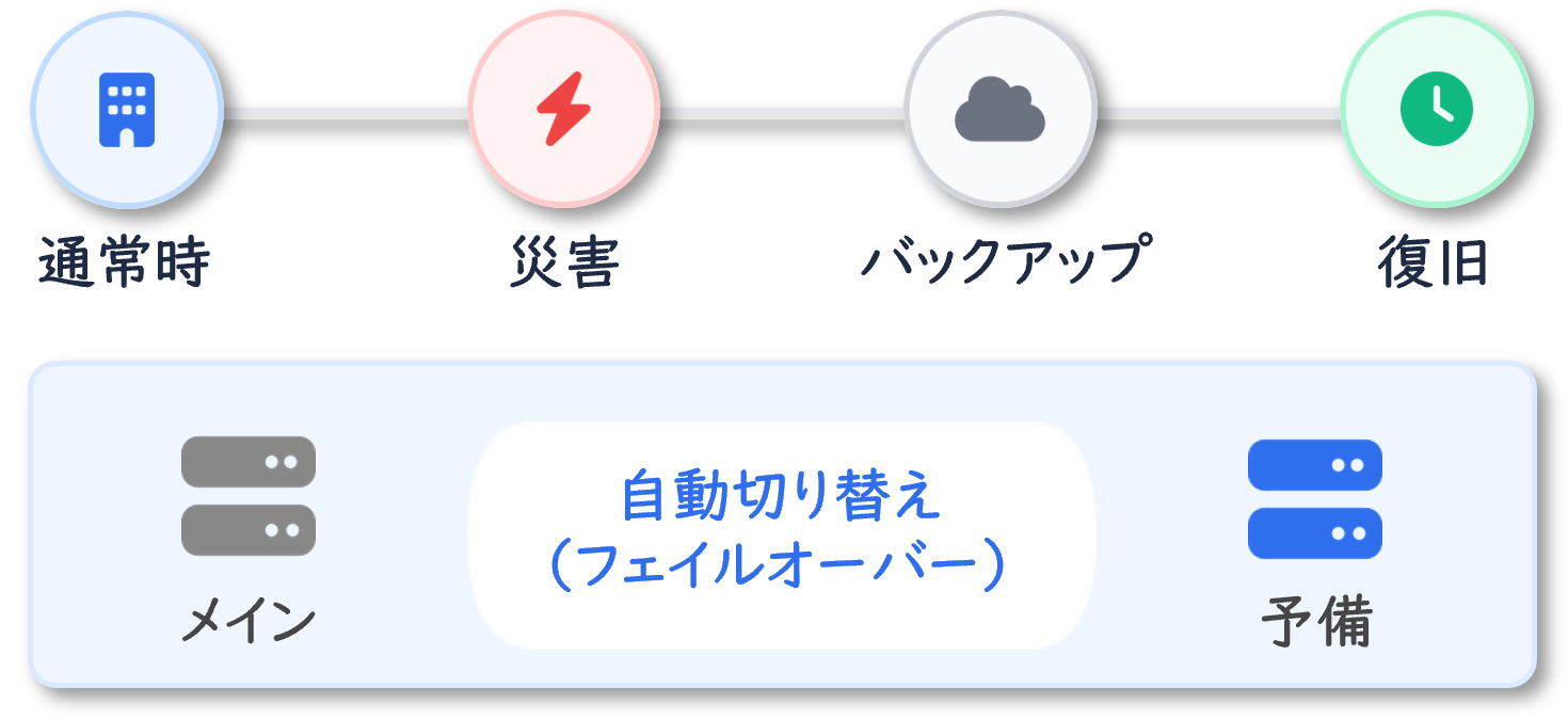 • データのバックアップや別地域への複製・復旧に関わる仕組みを利用できるため、専用設備を追加することなく、速やかな業務再開が可能です。