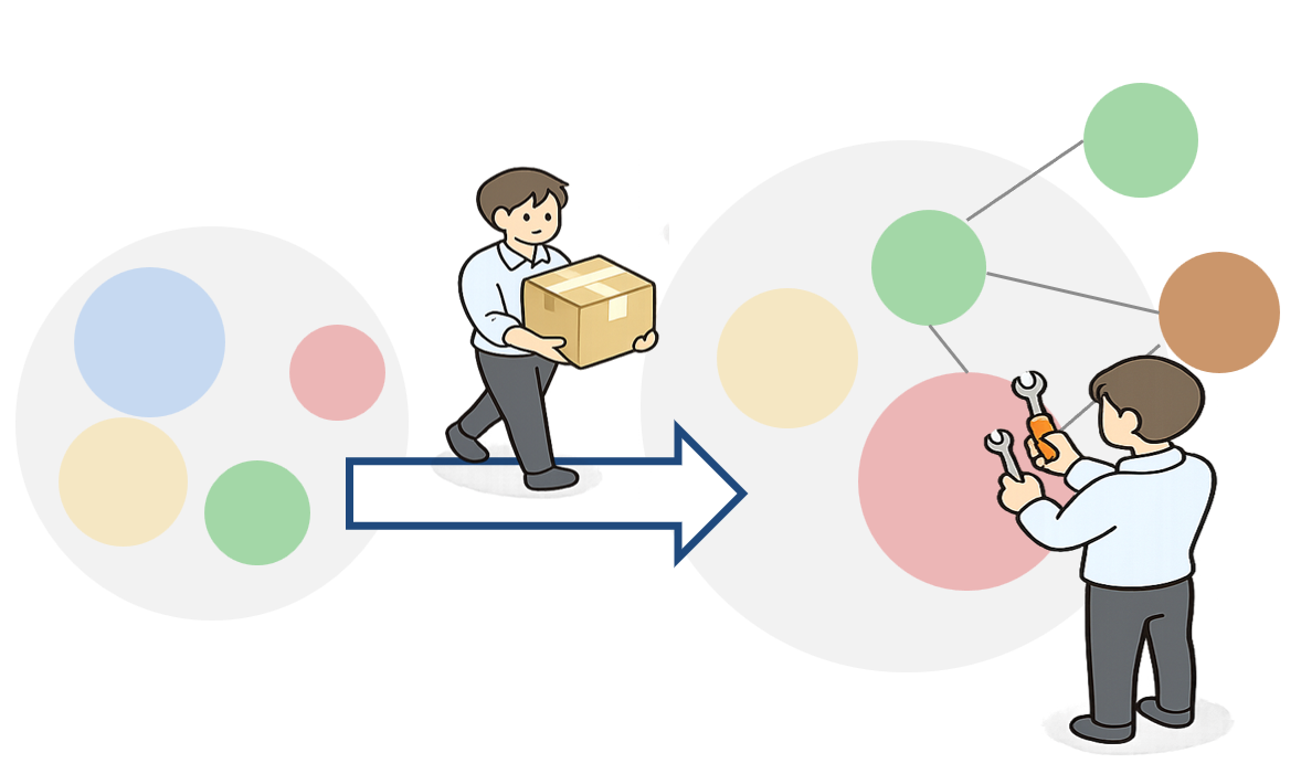• 各所に散在するデータの統合や、マスタデータ管理基盤の構築を目的とした移行です。項目の意味や使われ方を整理し、分かりやすいデータ構成に見直します。