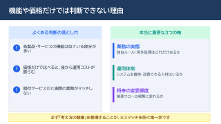 本資料では、「自社はどれが合うのか」を整理するための判断フローチャートや、よくある失敗パターンをまとめております。